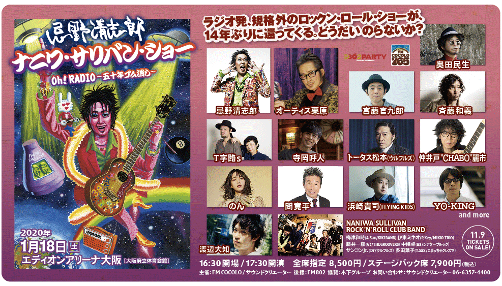 ![]() 忌野清志郎 ナニワ・サリバンショー Oh!RADIO 〜五十年ゴム消し〜 2020年1月18日(土)エディオンアリーナ大阪(大阪府立体育会館) 開場16:30/開演17:30 ■出演:忌野清志郎/オーティス栗原/ 奥田民生/宮藤官九郎/斉藤和義/T字路s/寺岡呼人/ トータス松本(ウルフルズ)/仲井戸”CHABO”麗市/ のん/間寛平/浜崎貴司(FLYING KIDS)/YO-KING/渡辺大知…and more! ■NANIWA SALLIVAN ROCK’N’ ROLL CLUB BAND] 梅津和時(A.Sax/KIKI BAND)/伊東ミキオ(P.Key/MIKIO TRIO)/ 藤井一彦(Gt./THE GROOVERS)/中條卓(Ba./シアターブルック)/ サンコンJr.(Dr./ウルフルズ)/多田葉子(T.Sax/こまっちゃクレズマ) ■料金:全席指定 8,500円(税込) / ステージバック席 7,900円(税込) SOLD OUT! ■お問い合わせ:サウンドクリエーター 06-6357-4400 (平日 12:00〜18:00) | |||